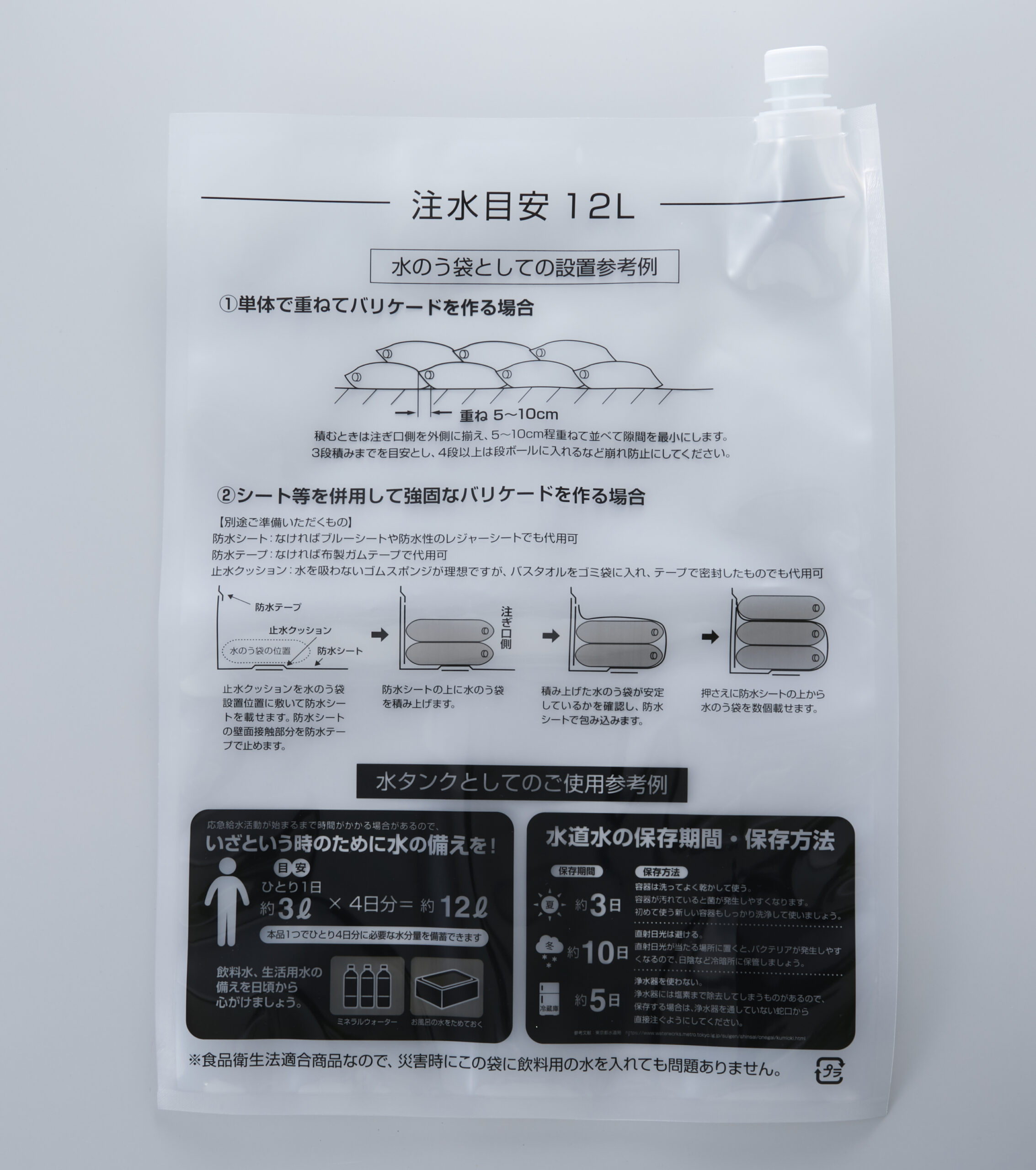 だけで後処理も簡単です。緊急時に飲料水用の水タンクとしても使える食品衛生適合品です。