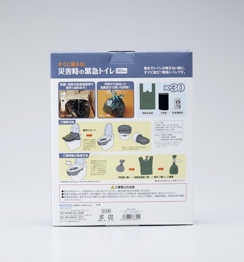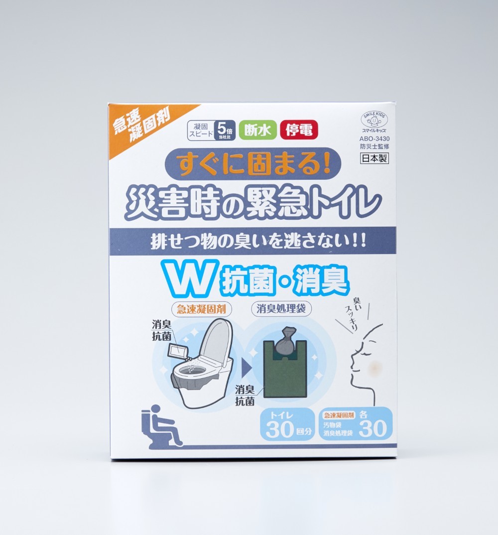 断水・停電時などの緊急時に水なしで使える簡易トイレです。凝固剤・処理袋共に第三者機関での厳しい抗菌・消臭試験をクリアしている高機能タイプの緊急トイレです。2重の抗菌・消臭機能で、尿などの排泄物をすばやく固めて密閉し、災害時に悪化しやすい衛生環境や悪臭対策のお役に立ちます。 地震・台風・停電・大雪・洪水・交通渋滞などの防災備蓄として食料・飲料・緊急トイレは3日~7日間分はご自宅や職場に備えるようにしましょう。いざという時、 水洗トイレは使えなくなります。食料はあったけど、トイレを我慢して体調を崩したという声も多く聞かれますので、トイレが止まっても大丈夫なように準備をしましょう。