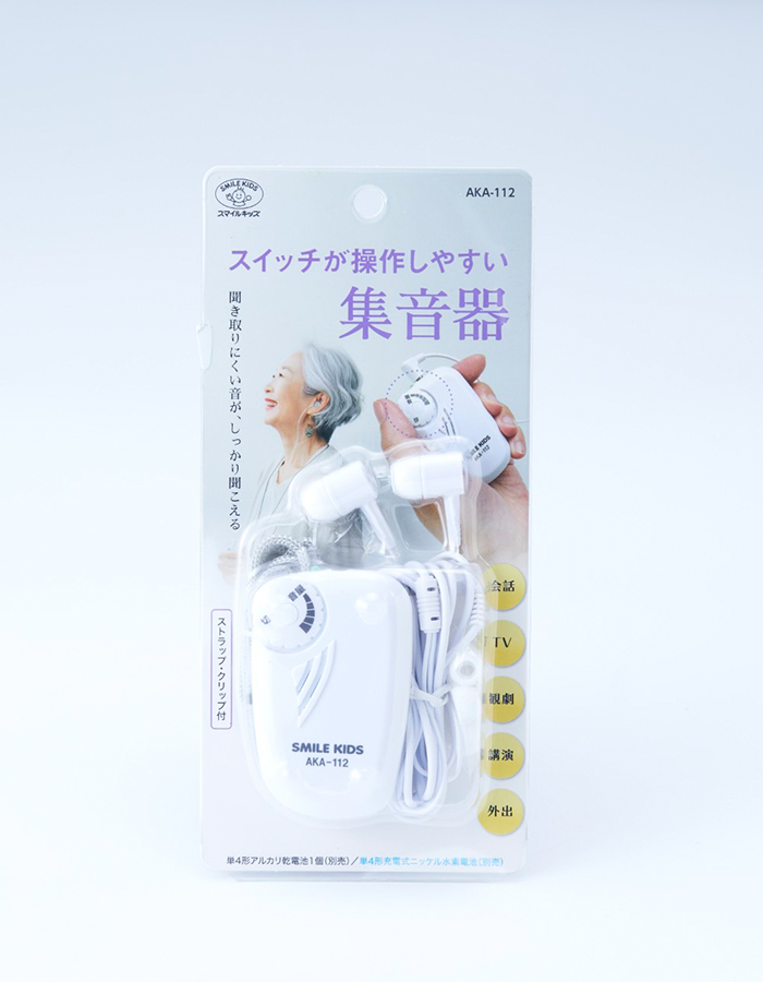 聞きづらい小さな音や声を大きく拡声する、両耳イヤホン式の集音器です。 (両耳には同じ音が出力されます。)