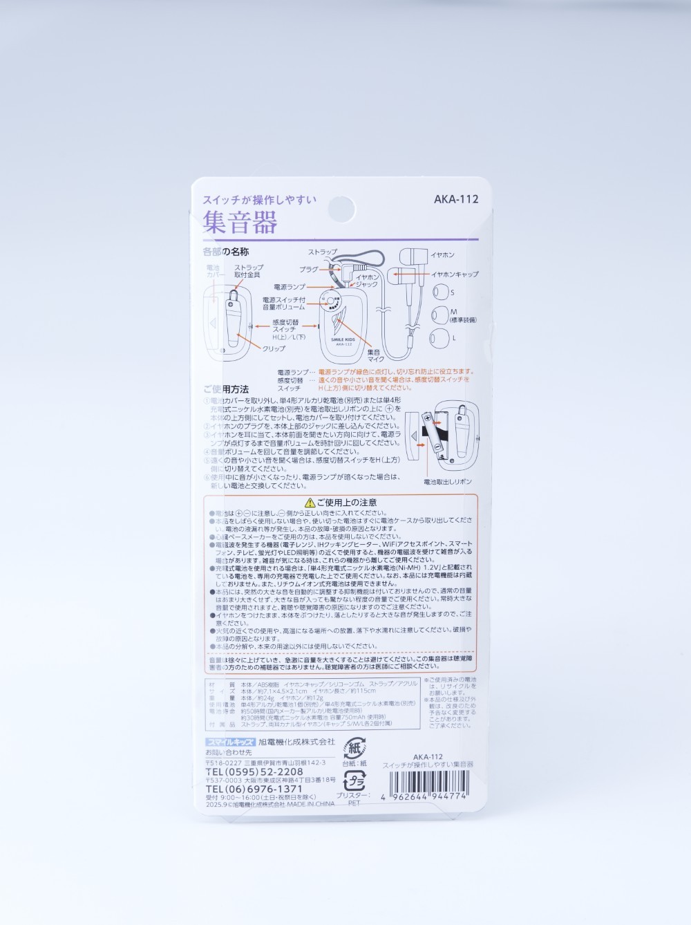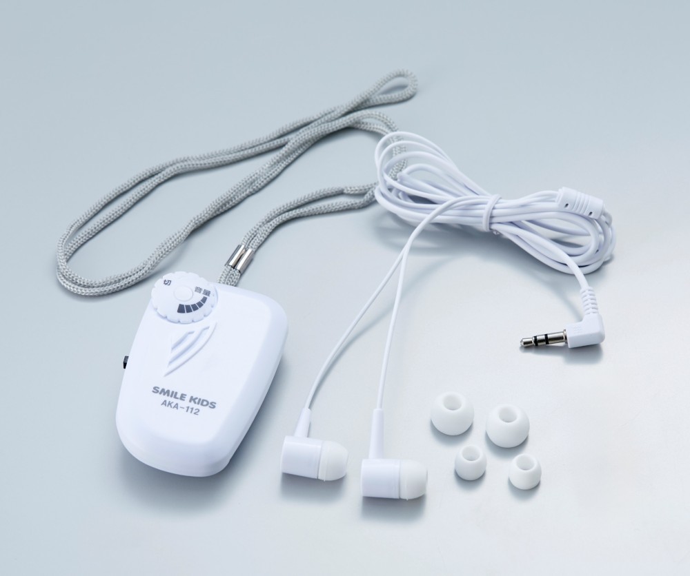 聞きづらい小さな音や声を大きく拡声する、両耳イヤホン式の集音器です。 (両耳には同じ音が出力されます。)